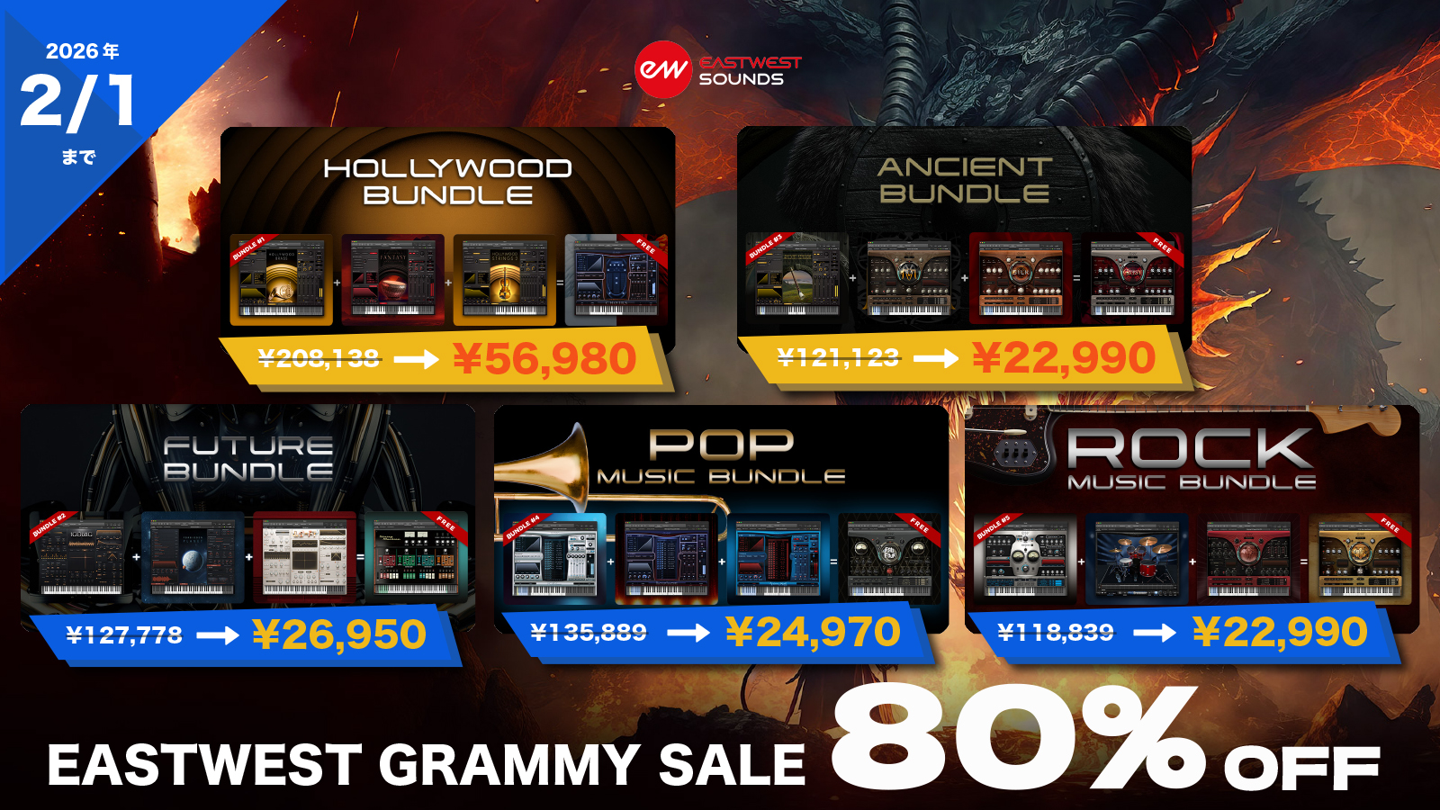 今回のグラミーセールでは、EastWest Soundsを象徴するオーケストラ音源Hollywood Orchestraを含むHollywoodシリーズ製品を4タイトルバンドルした「Hollywood Bundle」や、世界中の伝統楽器を網羅した4タイトルバンドルの「Ancient Bundle」、シンセサイザーコレクションの「Future Bundle」のほか「Rock Music Bundle」「Pop Music Bundle」これらがセール価格にて限定復活となります。