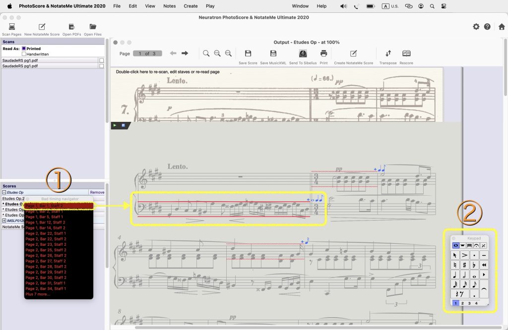 PhotoScoreでの修正作業は、基本的には①Bad timing navigatorの行をクリックし、中央の画面に表示された該当箇所をクリックして選択しては、②キーパッドを使って修正していくというものです。