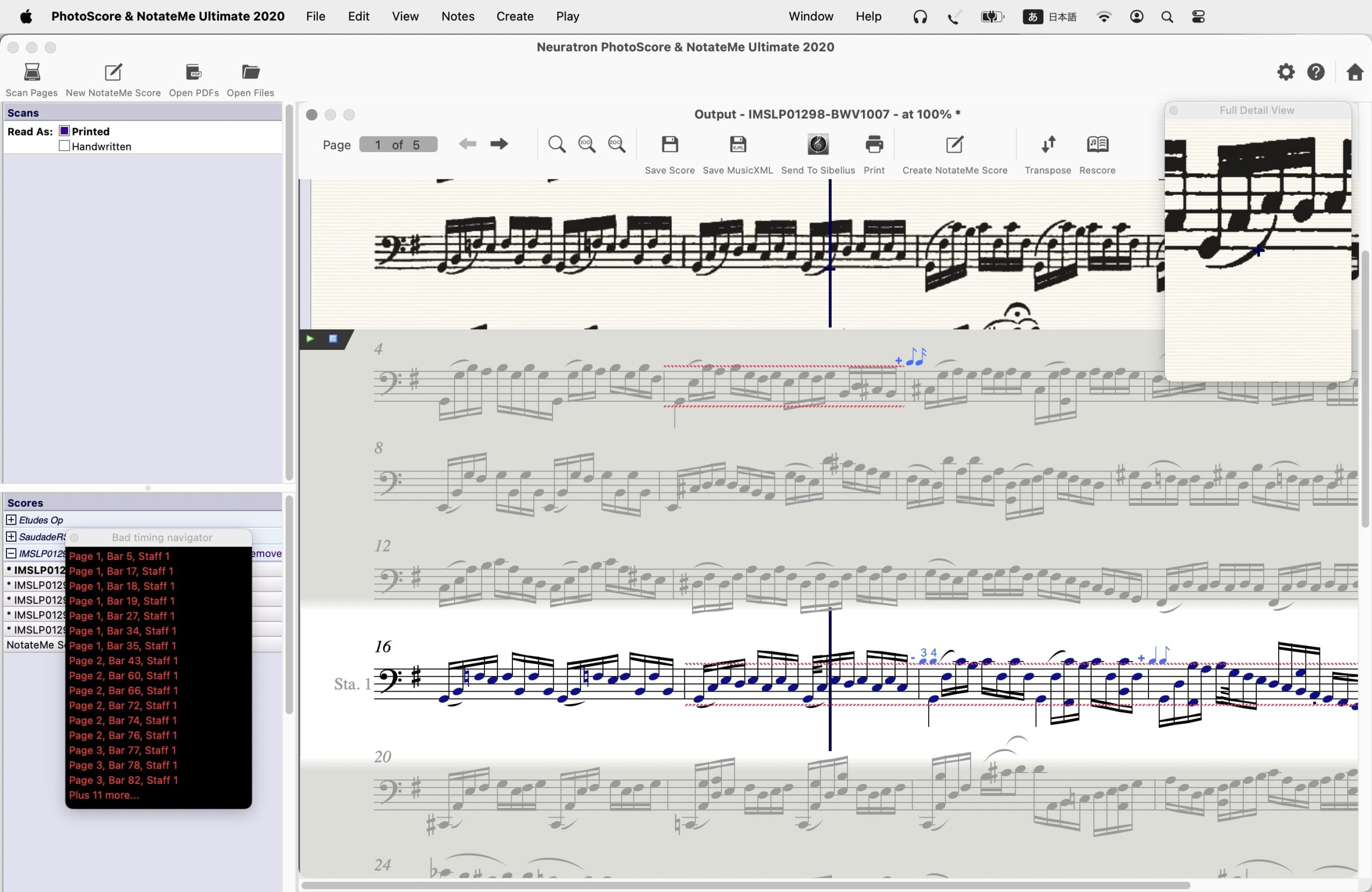 特に拍子や小節割などタイミングに関するエラーの修復が最重要で、その点においてはどの製品も充実した修正機能を持っていますが、中でもPhotoScoreは、操作画面のナビゲーションのし易さや、要修正箇所を一覧表で管理するBad timing navigatorの搭載など、使い易さには長けていると感じました。