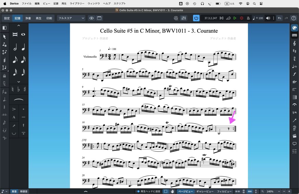 使用する楽譜は、ペトルッチ楽譜ライブラリー(ISMLP)から入手したバッハの無伴奏チェロ組曲(6 Cello Suites, BWV 1007-1012 (Bach, Johann Sebastian))より抜粋した「Cello Suite #5 in C Minor, BWV1011 – 3. Courante」です。