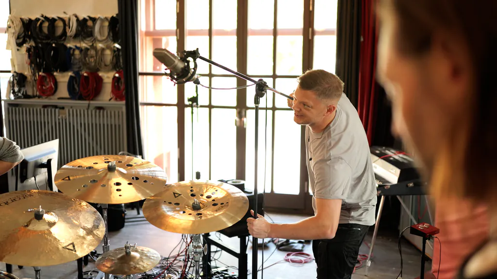 - フル装備のドラムキットに唯一無二のシンバルをセッティング