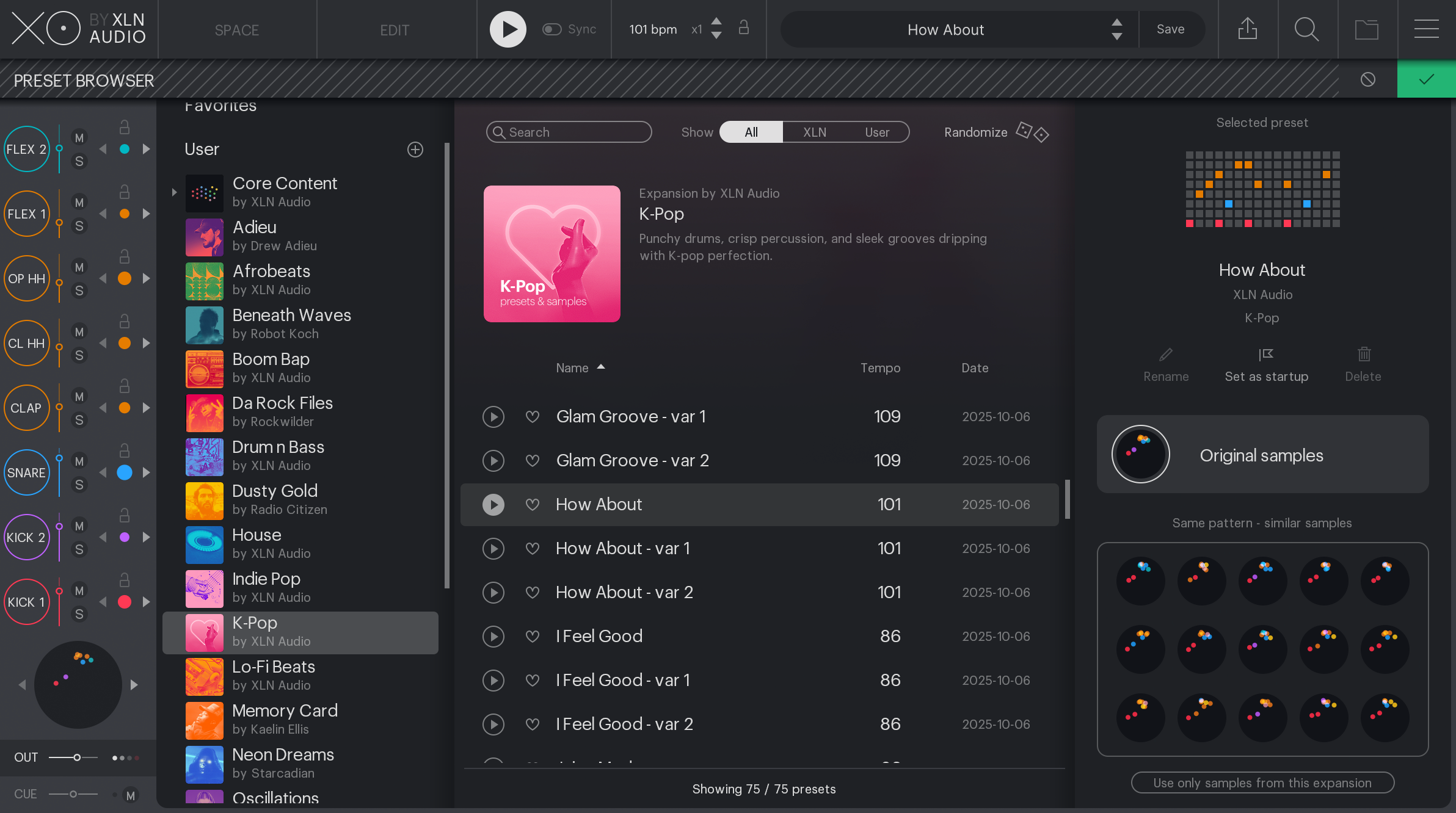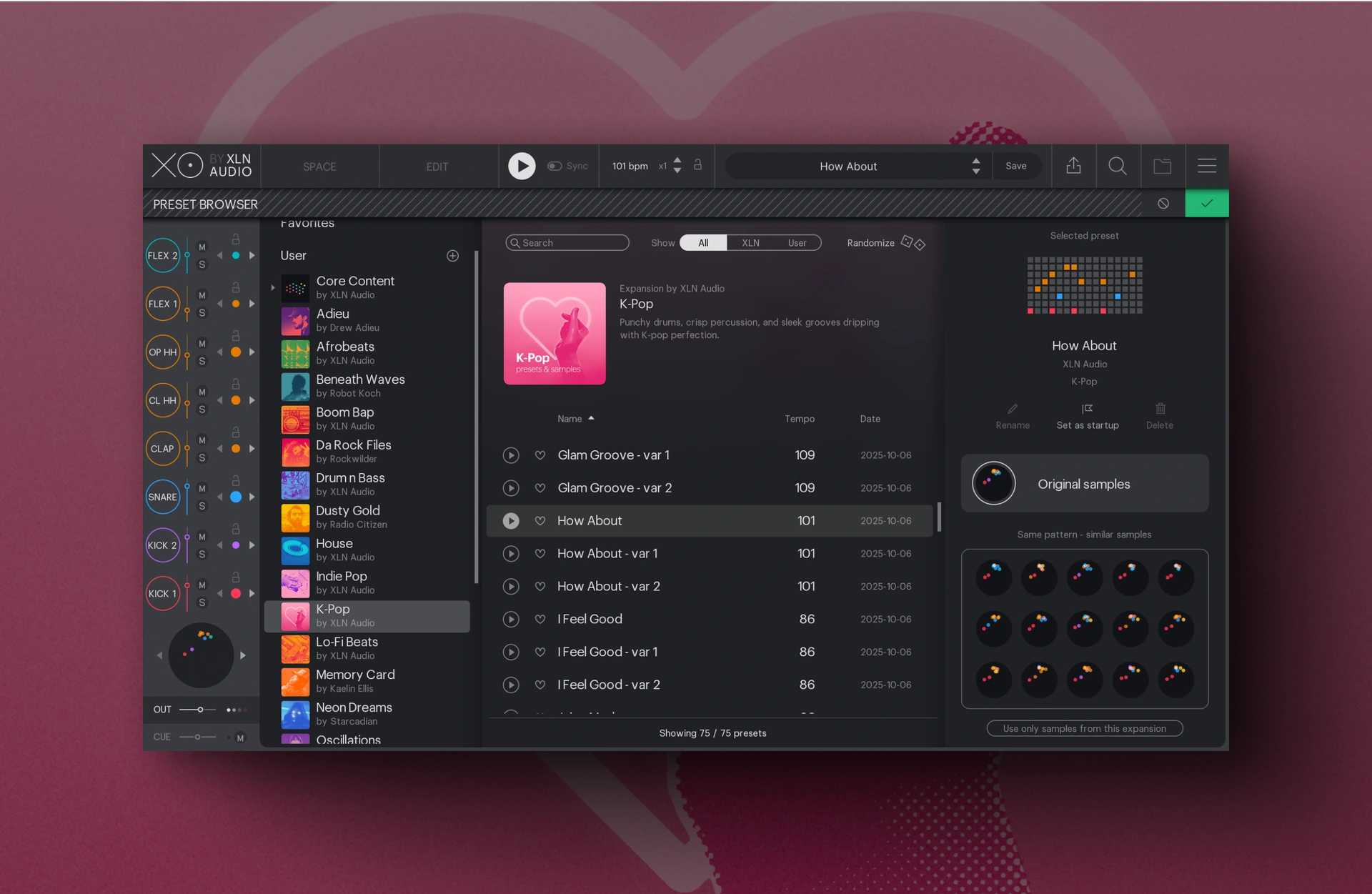ドリーミィなポップバラードからパワフルなダンスアンセムまで、あらゆる楽曲制作に最適化されたXOpak K-Popは、シャープなスネア、チューニングされた808、タイトなハイハット、そしてきらめくテクスチャを逃さず収録。BTS、BLACKPINK、SuperM、EXO、ITZY、NCT、Stray Kids、IVE、TWICE、BIGBANG、NewJeansにインスパイアされたトラックにすぐに取り入れることができます。XOの強力な機能を使えば、ボタンをクリックするだけで類似性の高いサンプルとサウンドを瞬時に切り替えられます。サンプルコレクションからお気に入りのサウンドに切り替えたり、特定の範囲でフィルタリングしてワイルドなバリエーションを作成したり、様々なアプローチを可能にします。