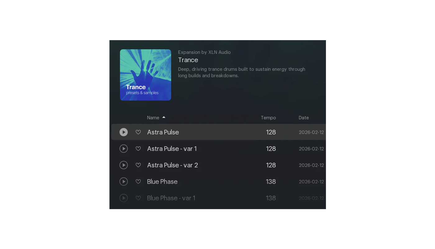 トランスは持続的なムーブの上に成り立っています。ゆっくりと上昇し、安定し、そして勢いを保ちながら解放されるエネルギー。このXO拡張パックには、伝統的なトランスからモダントランスに至るまでの幅広いプリセットが収録されています。駆動力をもたらす深くコントロールされたキック、うねるリズミカルなレイヤー、そしてタイトにシェイプされたトップに焦点を当て、気を散らすことなく”動き”を加えます。
