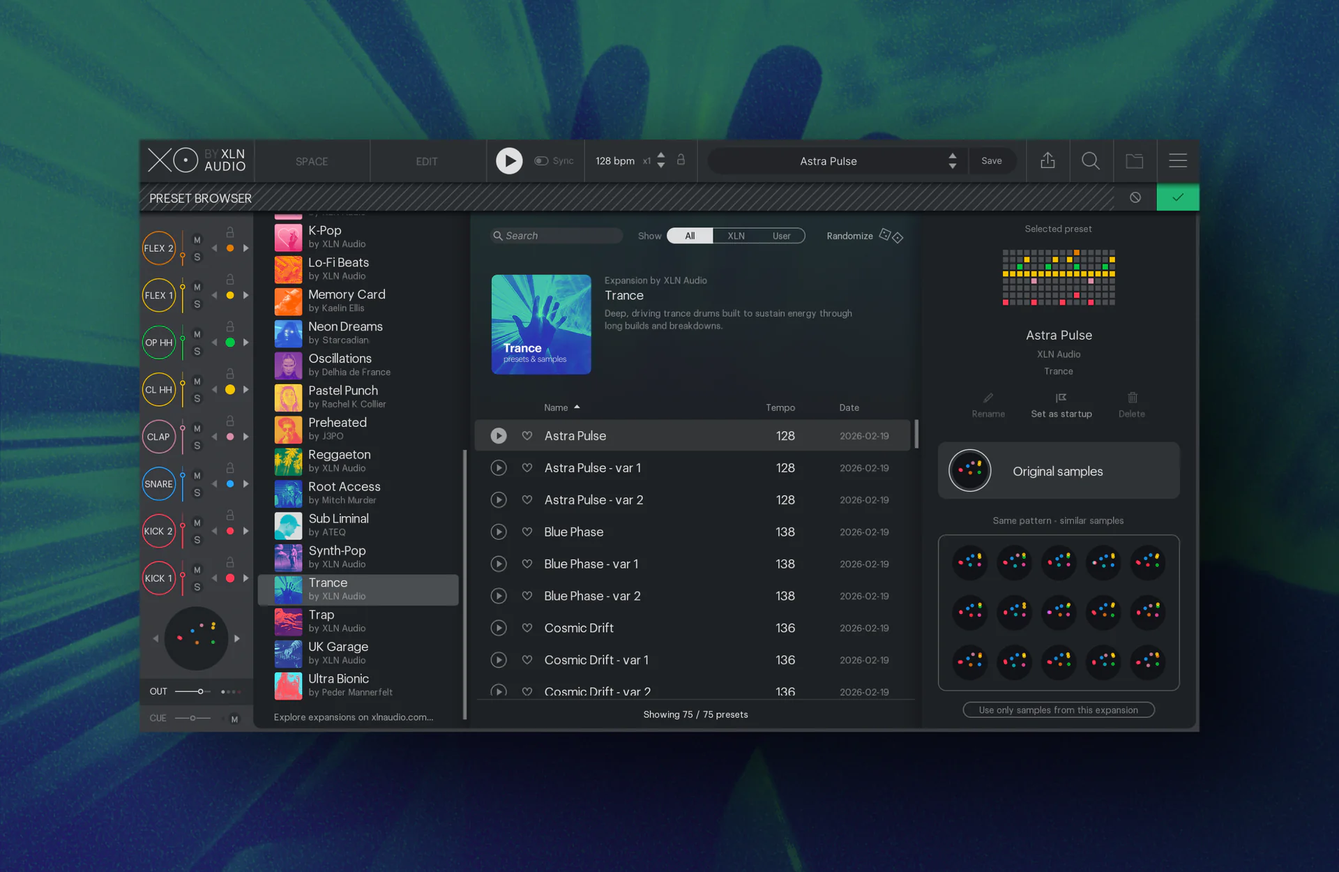 XOをお気に入りのサンプルパックから近隣の類似サウンドに切り替えることで、無限のビートバリエーションを探求できます。